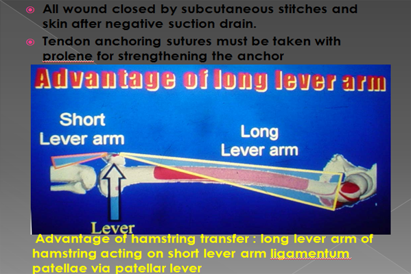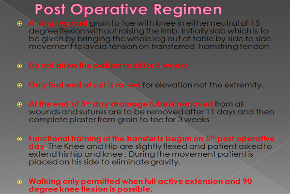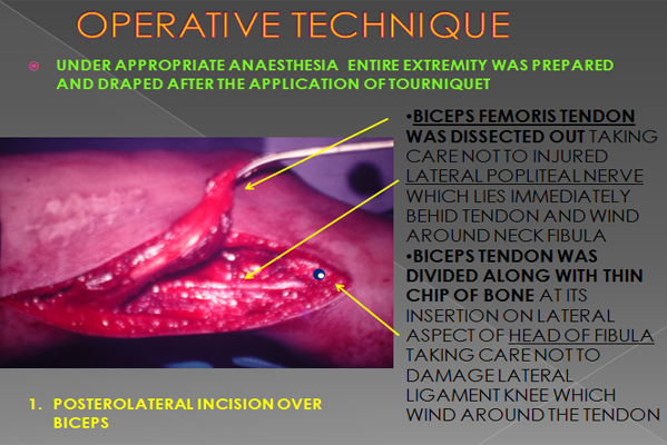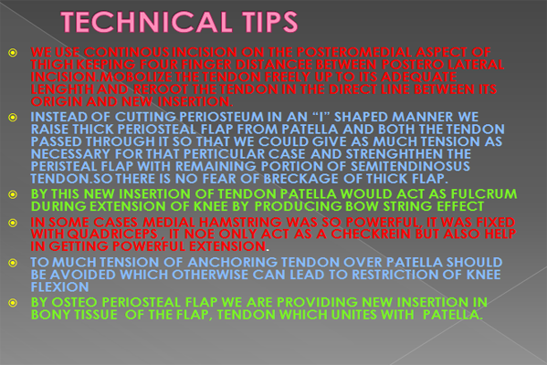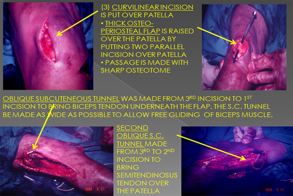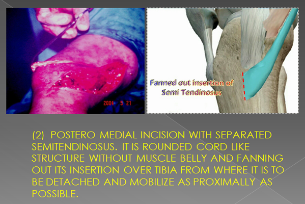 We Use Continous Incision On The Posteromedial Aspect Of Thigh Keeping Four Finger Distancee Between Postero Lateral Incision.Mobolize The Tendon Freely Up To Its Adequate Lenghth And Reroot The Tendon In The Direct Line Between Its Origin And New Insertion.