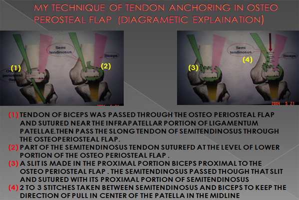 Instead Of Cutting Periosteum In An “I” Shaped Manner We Raise Thick Periosteal Flap From Patella And Both The Tendon Passed Through It So That We Could Give As Much Tension As Necessary For That Perticular Case And Strenghthen The Peristeal Flap With Remaining Portion Of Semitendinosus Tendon.So There Is No Fear Of Breckage Of Thick Flap.