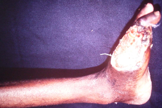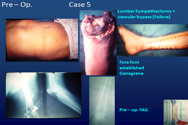 A 25 years old male, heavy smoker and tobacco chewer presented with TAO of left lower limb with non healing ulcer over medial aspect of foot with amputated great, second and third toes. Initially he was treated by general surgeon for lumbar sympethectomy without any improvement. After that vascular surgeon did by pass surgery by putting left radial arterial graft without any improvement. Ultimately patient came to us with rest pain, non healing ulcer with shaggy necrotic tissue.