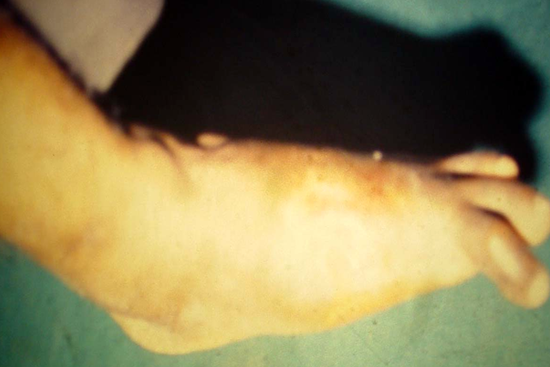 On arteriogram lower femoral and upper popliteal filling was present with absent dorsalis pedis and posterior tibial.